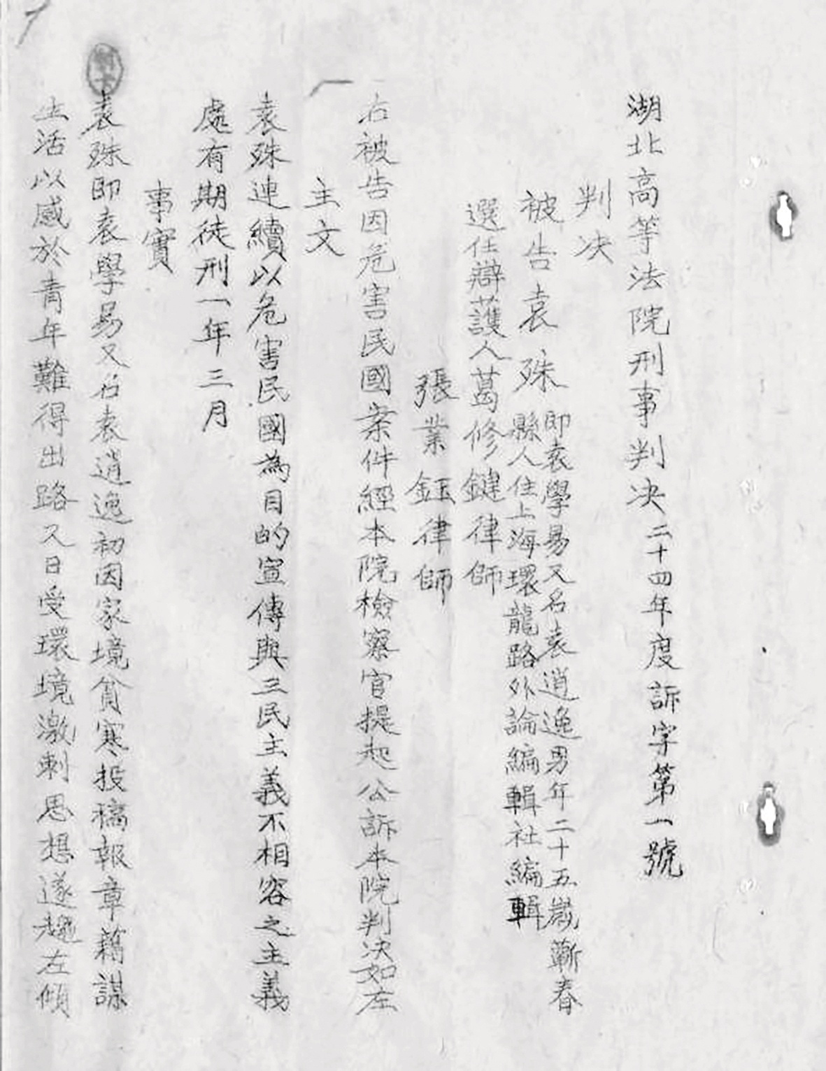 在湖北省檔案館,可以查到1935年中華民國湖北高等法院對袁殊的一份判決書。