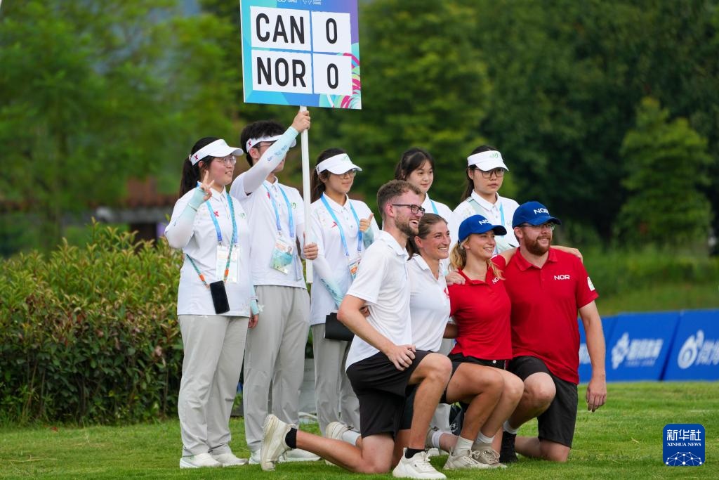 8月8日,加拿大選手和挪威選手在賽后合影。