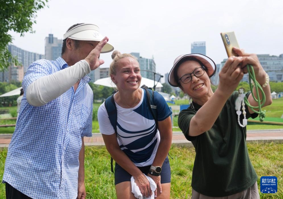 8月8日,愛沙尼亞選手克麗斯廷·拉特(中)在賽后與觀眾合影。