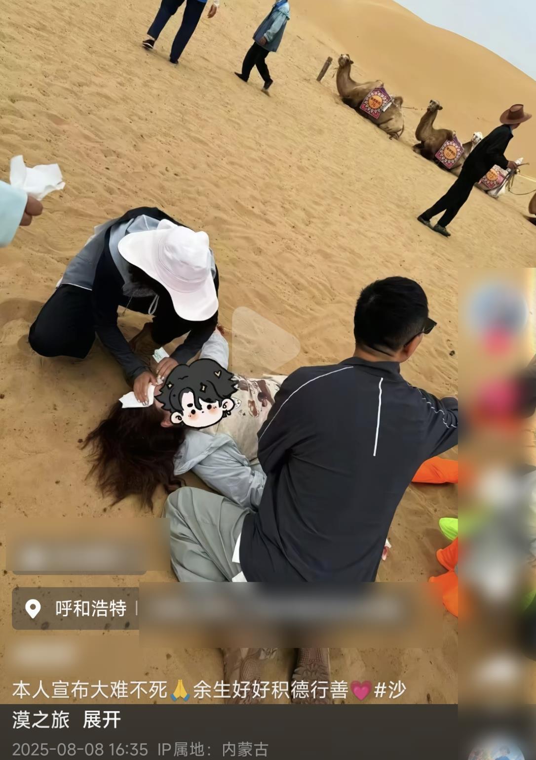 8月7日,來自河南的一名女游客帶著兒子,在內蒙古鄂爾多斯市一沙漠景區體驗騎駱駝項目時,駱駝突然受驚致母子二人摔落倒地。8日,這位女游客在社交平臺發文稱:“大難不死,差點被踢死。”9日,極目新聞記者采訪了解到,事發時,一對來自武漢的軍醫夫妻及時出手,為這名女游客緊急施救,并幫助她順利抵達當地醫院。