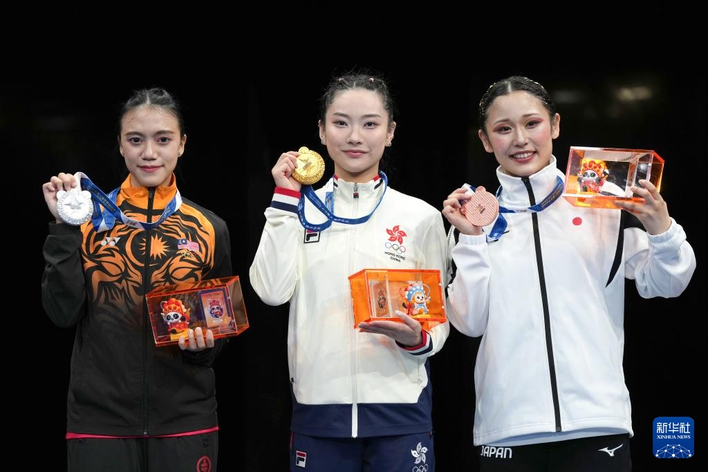 8月9日,冠軍中國香港選手沈曉榆(中)、亞軍馬來西亞選手彭牬爾(左)和季軍日本選手貴田菜花在頒獎儀式上。