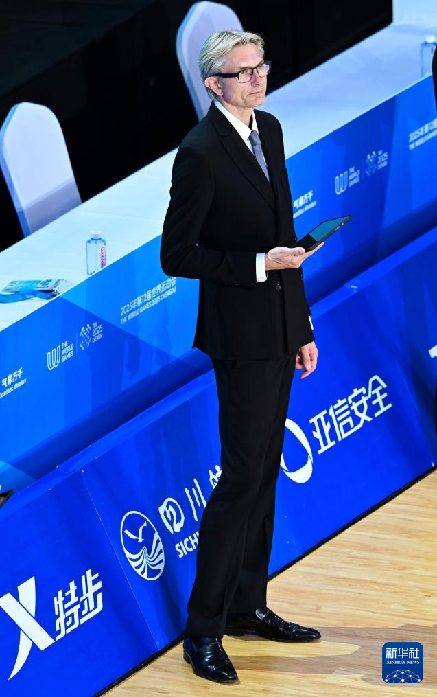 8月9日,拉脫維亞裁判辛金斯在比賽中觀看選手們的表現(xiàn)。