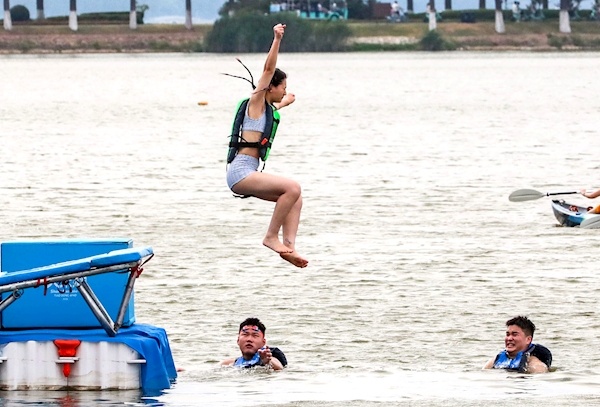 肆意江湖,痛快玩水。起跳、騰空、一個(gè)猛子扎進(jìn)東湖,頓時(shí)水花飛濺……8月9日,在武漢東湖楚城腳下,被武漢人稱為夏日必修課的“跳東湖”活動(dòng)熱鬧上演。數(shù)百名參與者縱身躍進(jìn)碧波蕩漾的東湖,享受夏日清涼。“跳東湖”已持續(xù)了14年,今年依舊火爆。主辦方介紹,兩天共計(jì)500個(gè)跳水名額,在開放報(bào)名5分鐘之內(nèi),便被一搶而空。