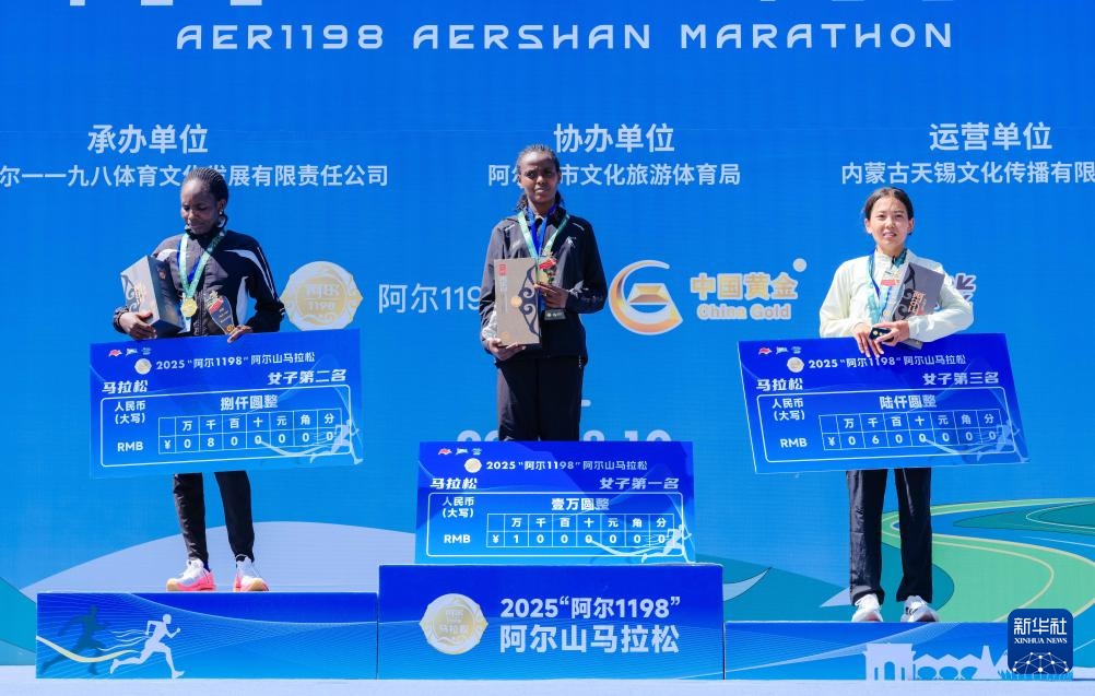 8月10日,亞軍肯尼亞選手基普羅蒂奇、冠軍埃塞俄比亞選手古塔、季軍中國選手通拉嘎(從左至右)在女子全程馬拉松頒獎儀式上。
