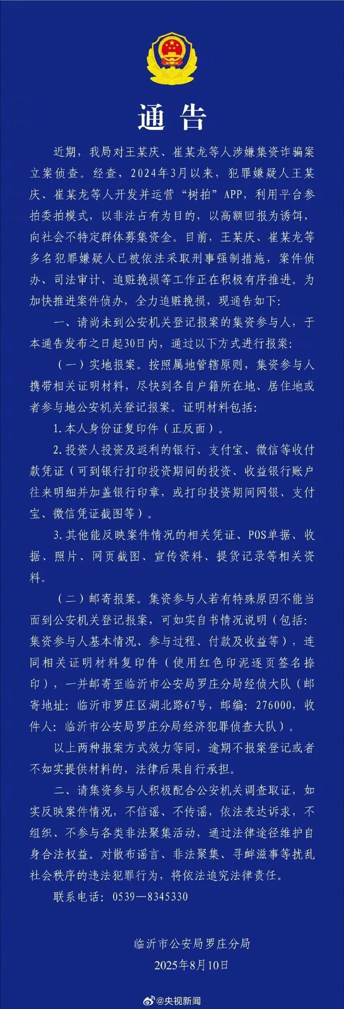 今天,山東臨沂市公安局羅莊分局發布通告,稱對王某慶、崔某龍等人涉嫌集資詐騙案立案偵查。