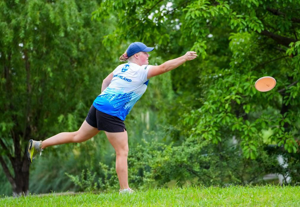 8月9日,芬蘭隊選手薩洛寧在比賽中擲飛盤。新華社記者 陳欣波 攝