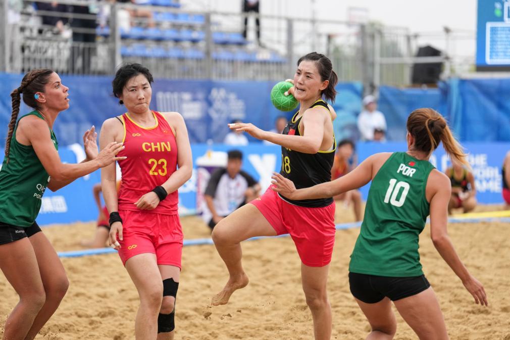 8月8日,中國隊球員沈萍(右二)在比賽中進攻。當日,在2025年成都世運會沙灘手球女子預賽中,中國隊不敵葡萄牙隊。新華社記者 劉坤 攝