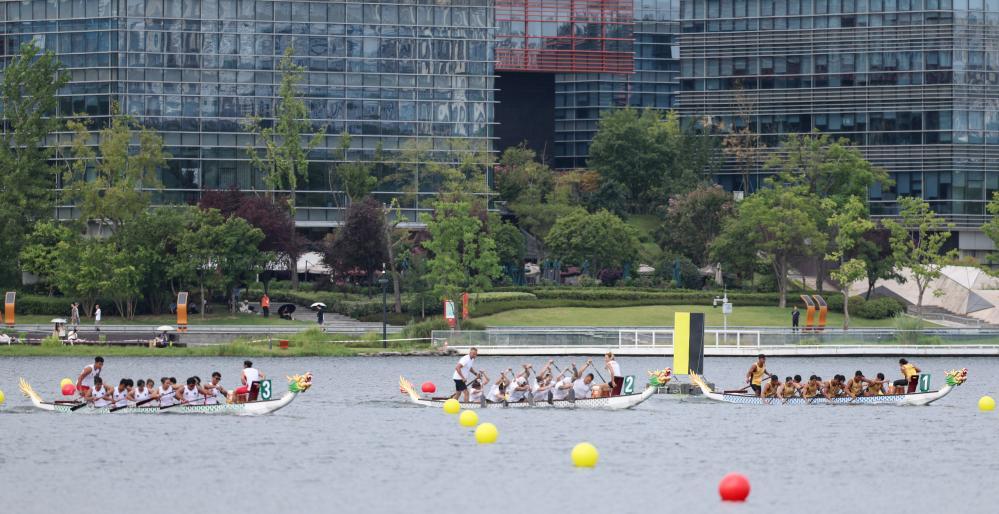 8月9日,龍舟比賽在興隆湖湖濱賽場開賽。除龍舟賽外,皮劃艇馬拉松比賽也在同一賽場進行。觀眾們坐在湖邊視野開闊的觀賽席,為運動健兒們吶喊助威。