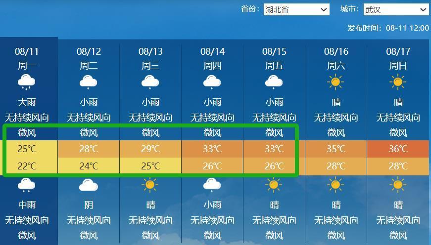 周四周五,武漢最高氣溫達到33℃,炎熱上線;待雙休,35℃+的高溫又開始冒泡,不過不是特別辛辣,高溫在35-36℃。