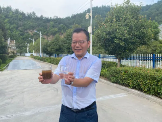 湖北山鼎環(huán)境科技股份有限公司董事長張寶軍展示十堰東部新區(qū)綜合污水處理廠進出水的情況。圖源新華社