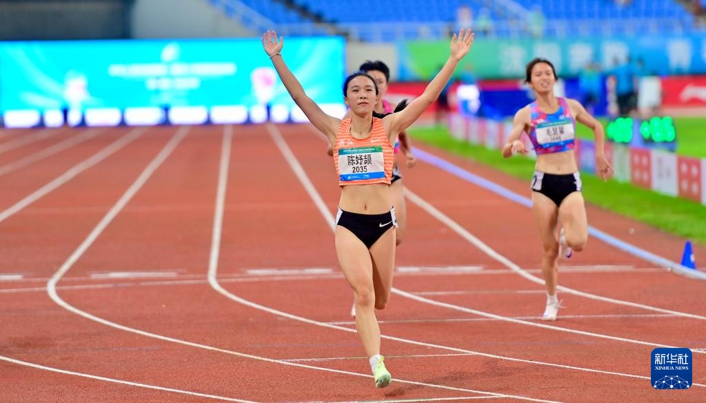 8月11日,浙江隊選手陳妤頡(前)在沖線后慶祝。她獲得冠軍。