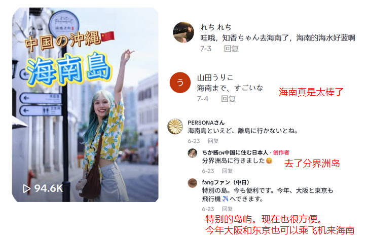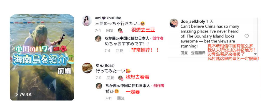 這些視頻引發了網友們的熱烈討論,不少人在評論區表達了對海南的向往?!拔蚁矚g中國”“很想去三亞”“我想去看看”,簡單直接的話語滿是期待。還有網友驚嘆:“真不敢相信中國有這么多我從未聽說過的神奇地方!分界洲島看起來棒極了,我打賭這里的景色一定很美!” 也有網友關注到交通的便利:“特別的島嶼,現在也很方便。今年大阪和東京也可以乘飛機來海南。” 在知香的鏡頭和分享下,海南成為國際網友旅游討論的熱門話題。
