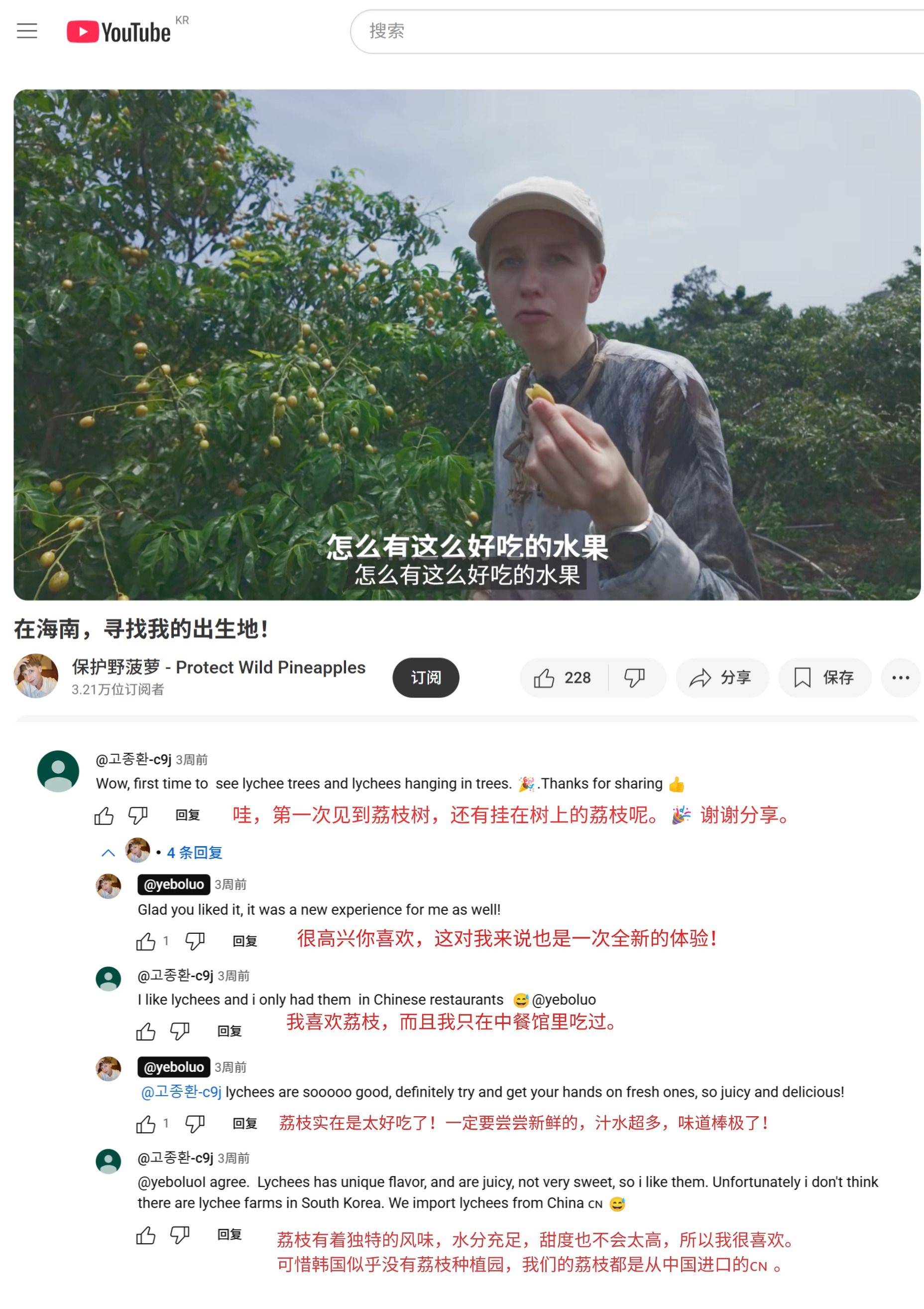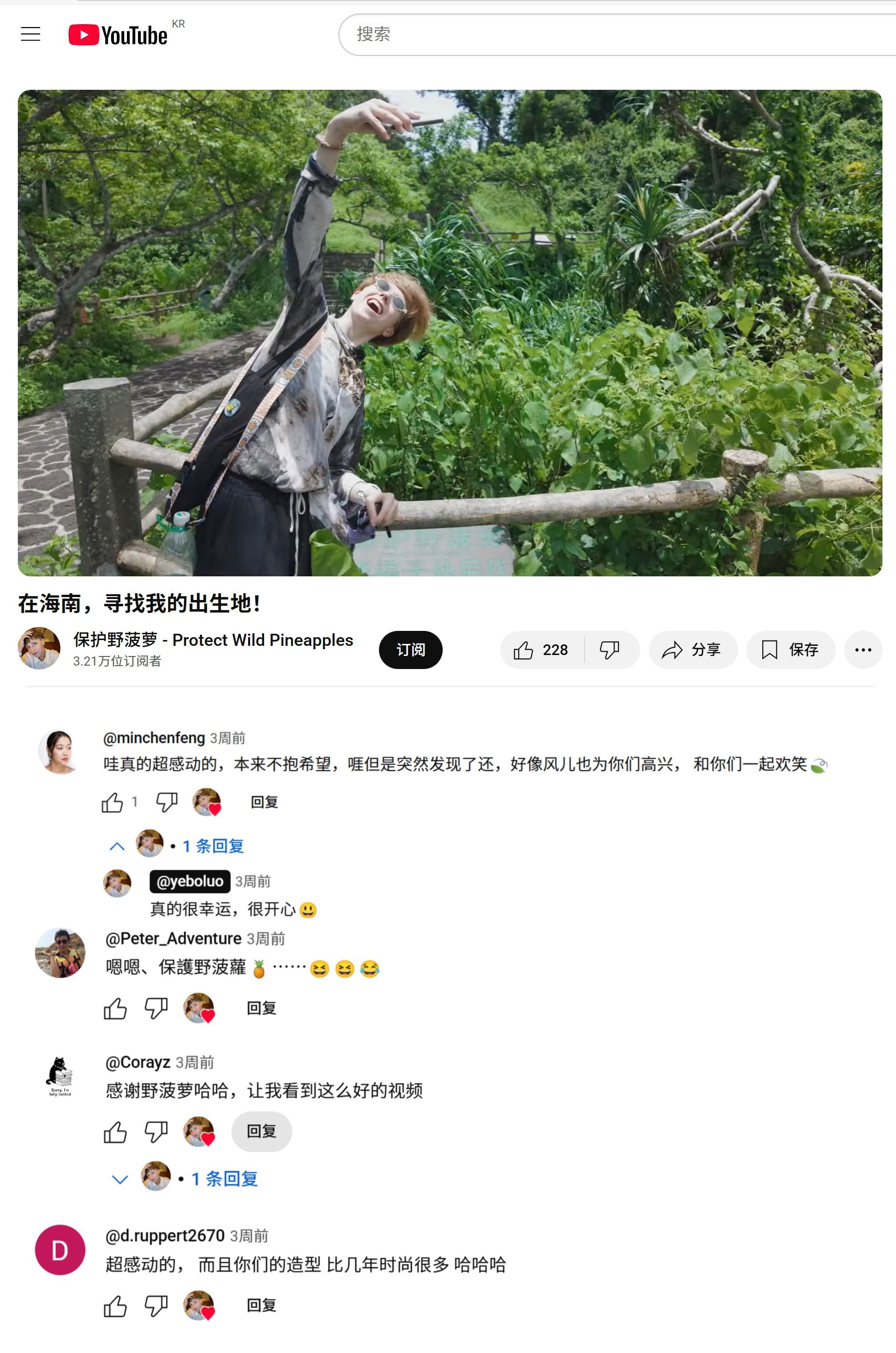 《在海南,尋找我的出生地!》一期視頻中,保護野菠蘿還介紹了她與海南的不解之緣,2019年,她來過這里,因在火山腳下看到了一塊“保護野菠蘿”的牌子。故2020年她的第一個視頻上線,頻道的名字就叫保護野菠蘿。此次回海南她還專程回到??诨鹕娇趯ふ伊水敃r的那塊牌子,歷經一段波折最終還是尋找到了當初的牌子,讓網友深受觸動,留言道“超感動的”。此外,野菠蘿還品嘗了火山荔枝王和海南的黃皮,點贊了海南的熱帶水果。