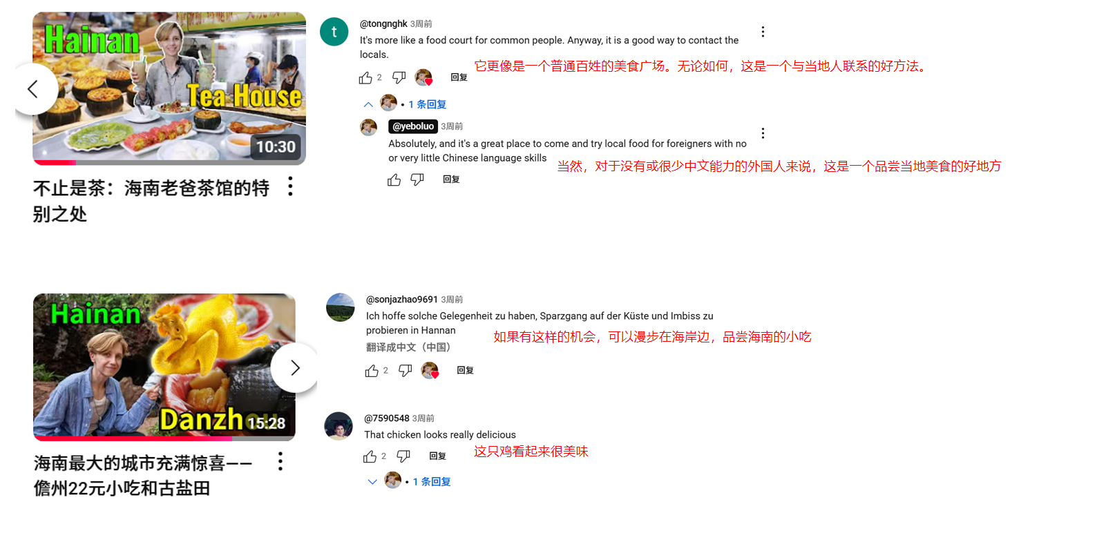 來自的德國的博主保護野菠蘿在YouTube、小紅書、抖音、嗶哩嗶哩(bilibili)等海內外平臺擁有89.7萬粉絲,其中在YouTube平臺頻道上就擁有3.21萬的訂閱者,頻道發布的《海南驚人的文化-中國的夏威夷》、《不止是茶:海南老爸茶館的特別之處》、《海南最大的城市充滿驚喜--儋州22元小吃和古鹽田》、《探索南灣猴島,在疍家漁排上吃“世界上最好吃的"河豚粥!》等旅行長視頻記錄,其帶有科普和沉浸式記錄性畫面和精美的剪輯方式,讓網友對海南的旅游、美食、歷史和文化有了全新的了解,印象也更加深刻。