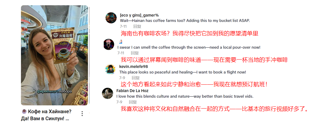 俄羅斯博主愛麗發布的關于萬寧興隆咖啡文化園的短視頻中,愛麗深入咖啡農場,以咖啡從種植到制作成飲品、品嘗獨特星座咖啡、風景如畫的咖啡文化園、絕佳的打卡拍照地等多個維度向網友展現了這里的獨特魅力,讓海南咖啡的故事在國際網絡上傳播,吸引了眾多海外網友對這片熱帶海島的關注。愛麗在海外社交平臺推薦道:“對于喜歡咖啡、大自然和新體驗的人來說,海南興隆咖啡文化園一定不能錯過,是必去的旅行目的地?!本W友的評論里表達了對海南種植咖啡及加工的驚奇?!昂D弦灿锌Х绒r場?我得盡快把它加到我的愿望清單里?!薄拔铱梢酝ㄟ^屏幕聞到咖啡的味道,現在需要一杯當地的手沖咖啡。”“這個地方看起來如此寧靜和治愈,我現在就想預訂航班!”