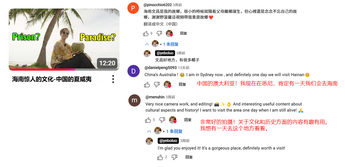 有網友留言道:“海南文昌是我的故鄉,很小的時候就隨著父母離鄉謀生,但心里還是念念不忘自己的故鄉,謝謝野菠蘿這視頻帶我重游故鄉”“中國的澳大利亞!我現在在悉尼,肯定有一天我們會去海南”“非常好的拍攝!關于文化和歷史方面的內容有趣有用,我想有一天去這個地方看看?!薄拔艺桨押飴u加到我的旅行清單里了”等。