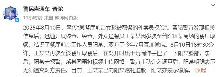 11日晚,@警民直通車_普陀發(fā)布通報稱,8月10日,網(wǎng)傳“某餐廳前臺女孩被取餐的外賣員摸臉”。普陀警方發(fā)現(xiàn)相關(guān)信息后,迅速開展核查。經(jīng)查,外賣送餐員王某某因多次至普陀區(qū)某商場的餐廳取餐,結(jié)識了餐廳前臺工作人員陽某,雙方于今年7月互加微信。8月10日18時30分許,王某某再次至該餐廳取餐后,在離開時出于玩鬧伸手捏了一下陽某臉部。事后,陽某未報警,系其同事將視頻上傳網(wǎng)絡(luò)。警方主動介入調(diào)查后,陽某明確表示無須追究對方責任。目前,王某某已向陽某賠禮道歉,陽某亦表示諒解。