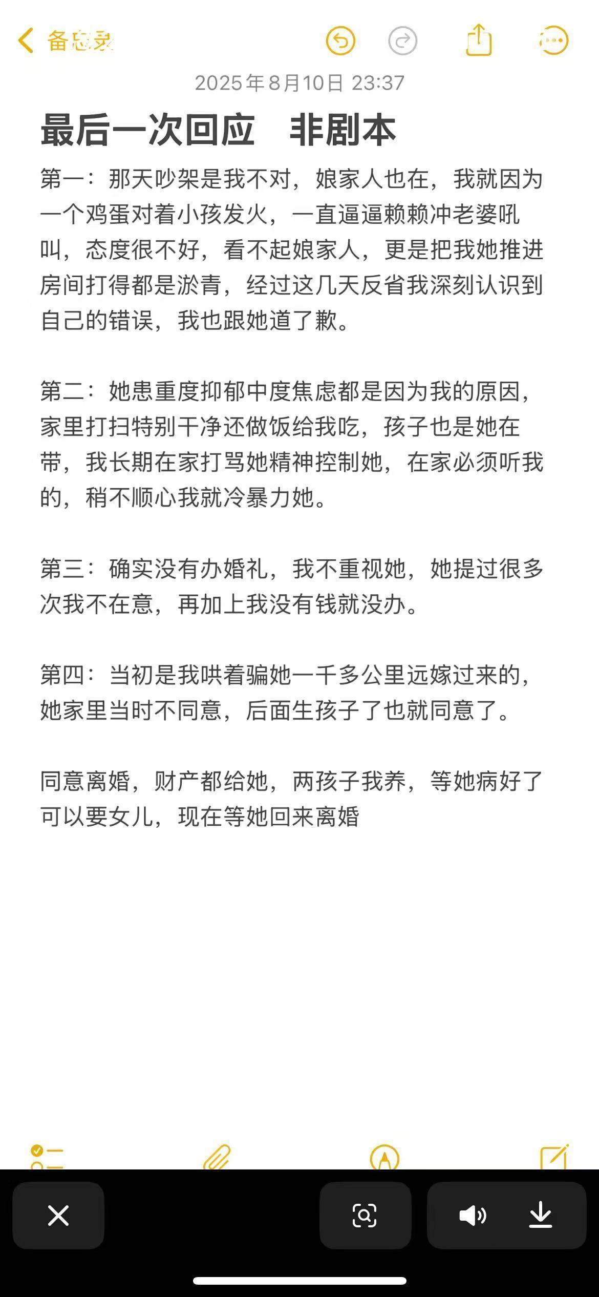 8月10日晚,網名為“山水”的網友發帖,自稱是事件中的男方并發布道歉聲明,聲明稱事件并非“劇本”,并向妻子道歉,他承認了一系列粗暴對待妻子的行為,并表示女方“患有重度抑郁癥和中度焦慮癥,都是“我的原因”,同時,他表示同意離婚,承諾將財產留給女方,并爭取兩個孩子的撫養權。