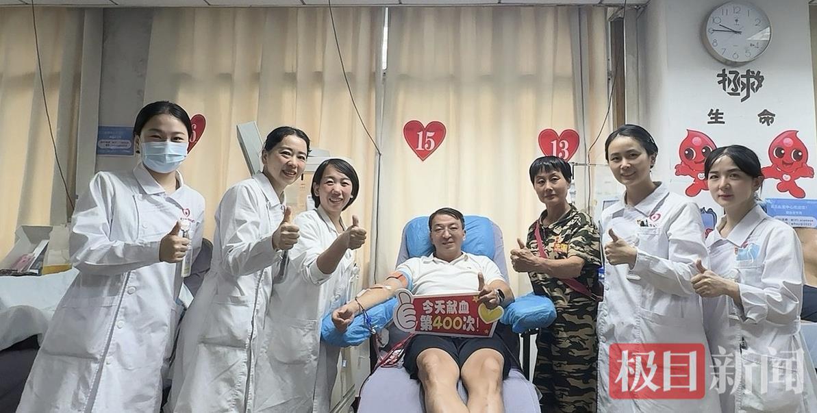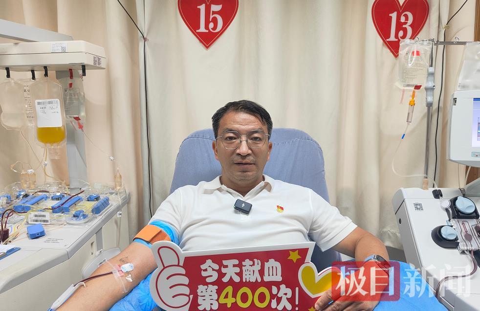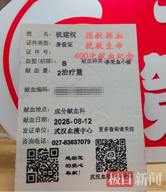 8月12日上午,58歲的江漢區河道堤防管理所管理員杭建權和往常一樣,走進了熟悉的武漢血液中心成分獻血科,坐上采血椅,伸出手臂,獻出2個劑量的血小板,可這天又格外特殊,這是他人生中的第400次獻血,他成了武漢市首位無償獻血達400次的愛心人士,也是目前武漢市獻血次數最多的獻血者,從1995年至今,他累計捐獻全血2次,400毫升;捐獻成分獻血398次,679個治療劑量,捐獻的血液足以讓680余位患者得到及時的救治。