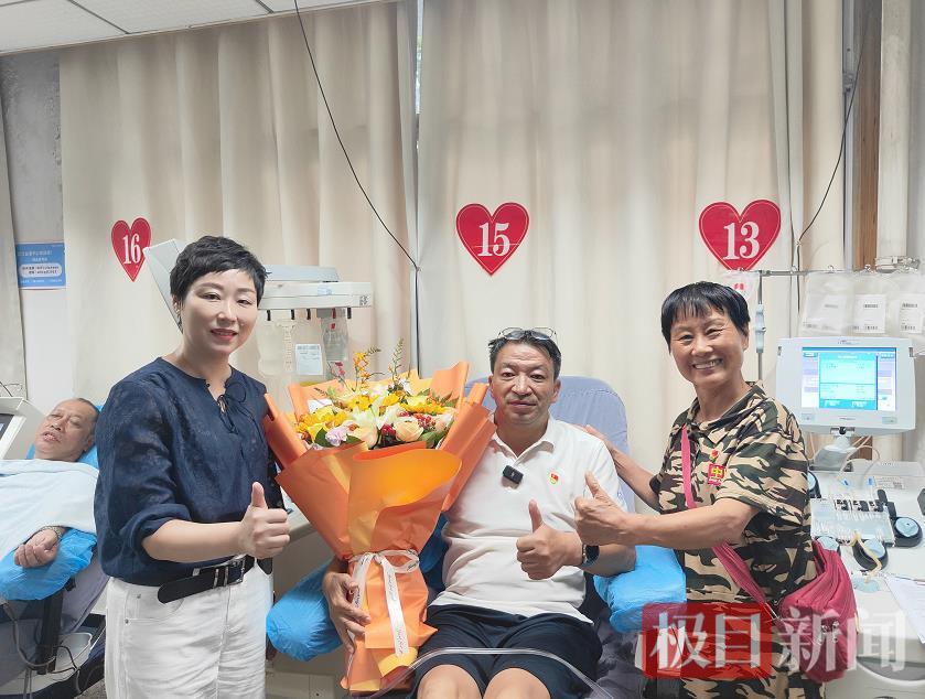 “杭老師,感謝您多年的熱血堅守。”武漢血液中心副主任杜思穎向杭建權送上了鮮花,成分獻血科醫護人員代表集體為他點贊,向他致敬。杭建權說,自己的398次成分獻血都是在這里完成的,每次來成分獻血科就像回家一樣,這里的服務讓人倍感溫暖,這也是他堅持獻血的動力之一。“好多醫護人員我都認識,她們陪伴我走過了人生中很難忘的時光,我也見證了她們中不少人的美好芳華。”