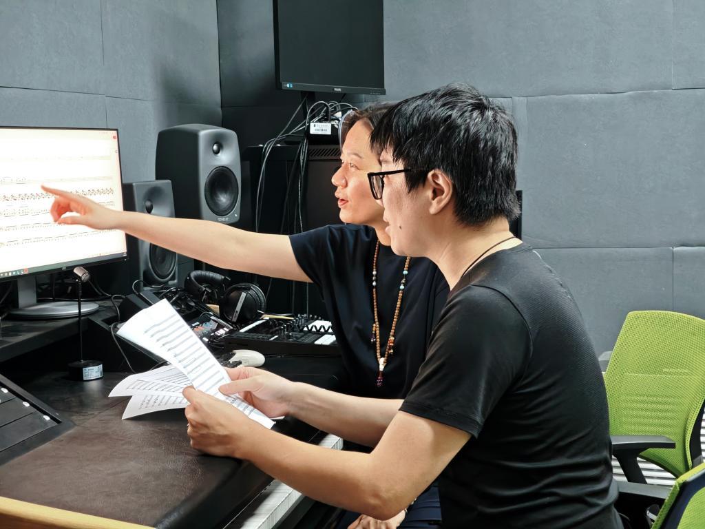 團隊主創成員王欣、王子堃(前)在討論修改樂譜。(受訪者供圖)