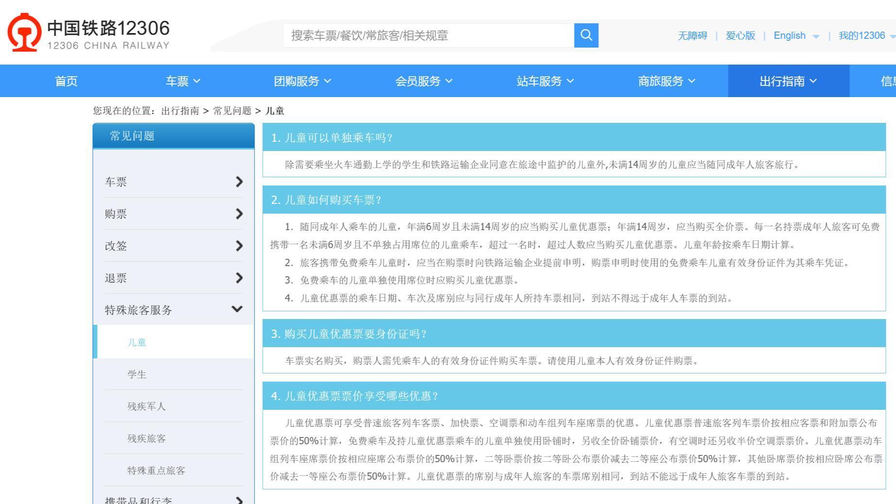 鐵路12306網站關于兒童票的規定(截圖自12306網站)