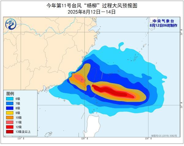 12日至14日,臺灣以東洋面、巴士海峽、臺灣海峽、南海東北部、東海西南部等海域及臺灣島大部、福建南部、廣東東部沿海地區將有8至10級風,臺風中心經過附近海域及地區風力可達11至14級、陣風15至16級。