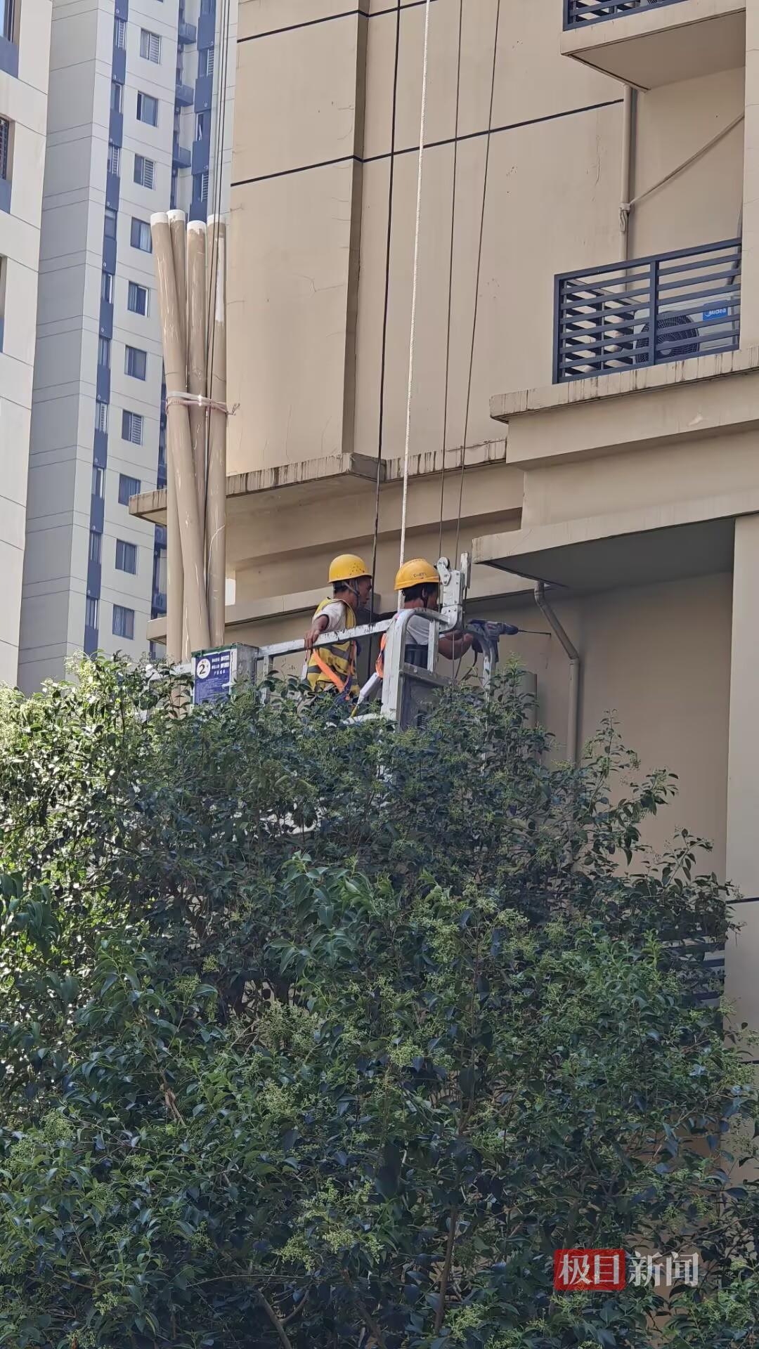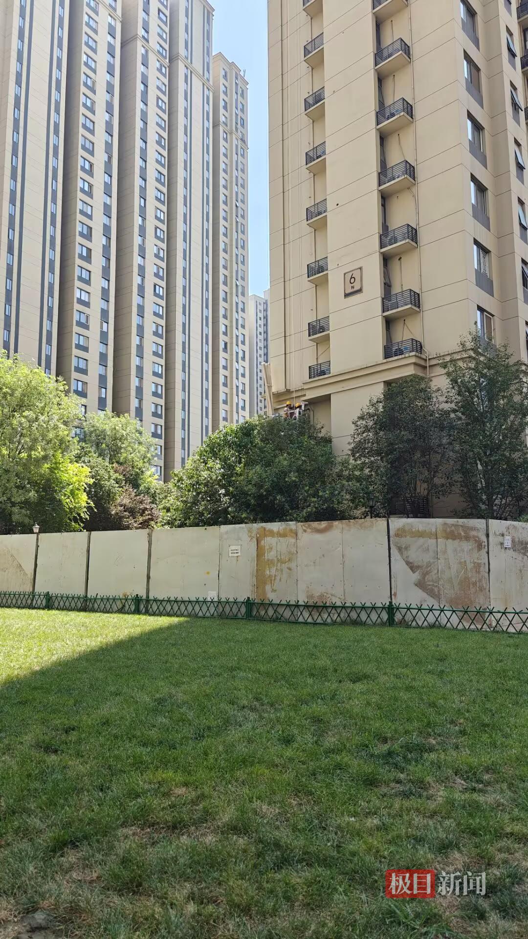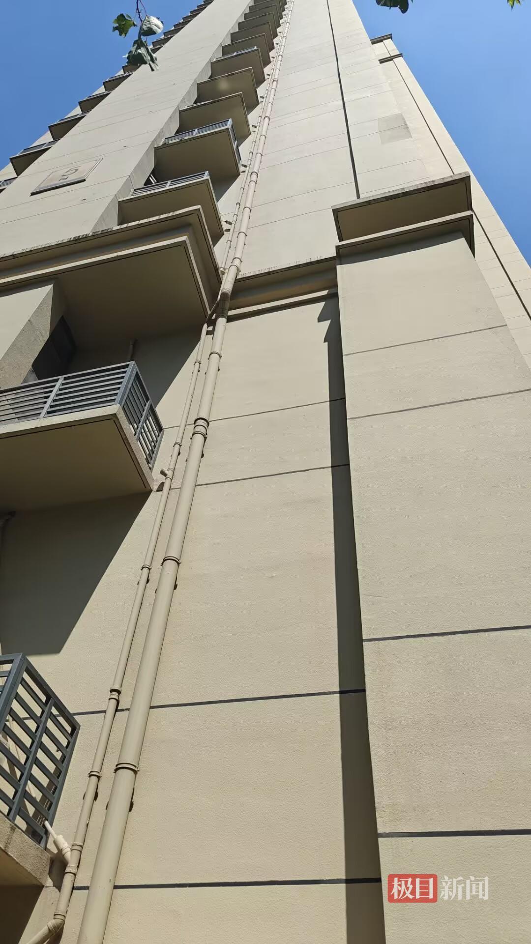 8月12日上午,極目新聞記者來到小區,事發樓棟建成于2017年12月,共34層,周圍有多組下水管,負責收集樓頂雨水,發生脫落的下水管已被全部拆下,人行道被鐵板擋住,隱約可以看到有施工人員正在更換新的下水管道。樓下依舊有許多老人在帶孩子玩耍。