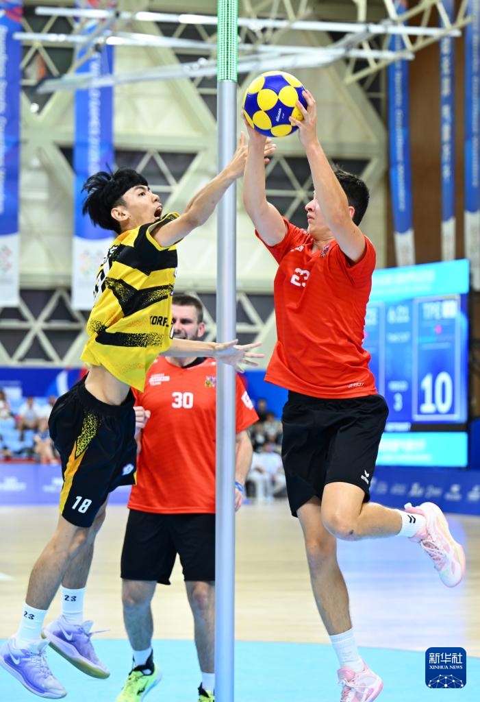 8月12日,中國臺北隊球員徐境晨(后右)在比賽中阻擋對方傳球。