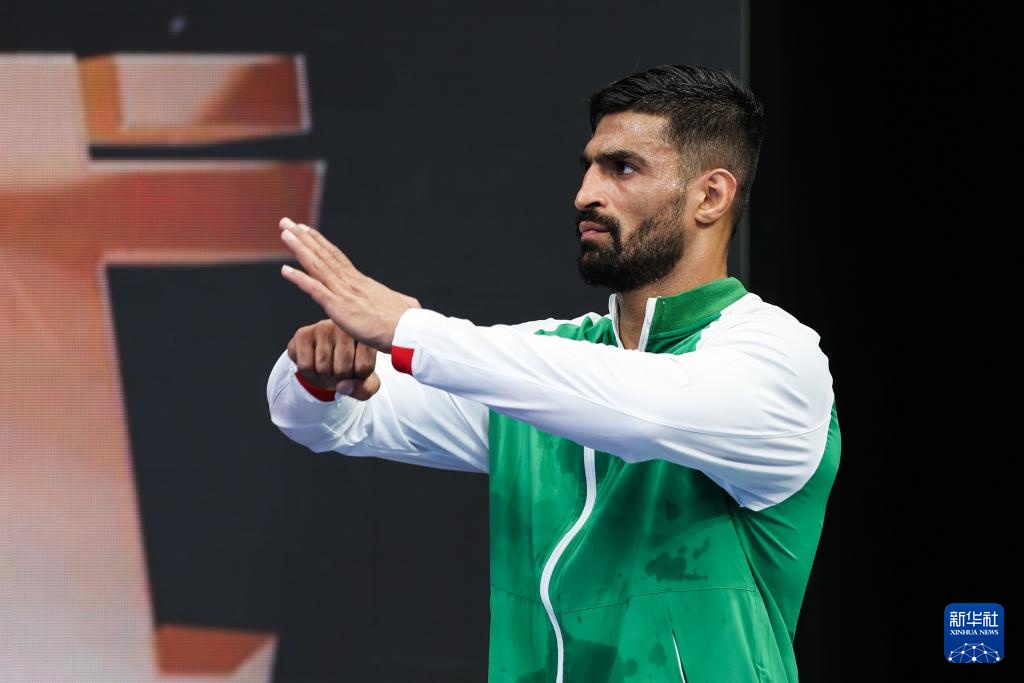 8月12日,亞軍伊朗選手穆罕默德禮薩在領獎臺上向觀眾致意。