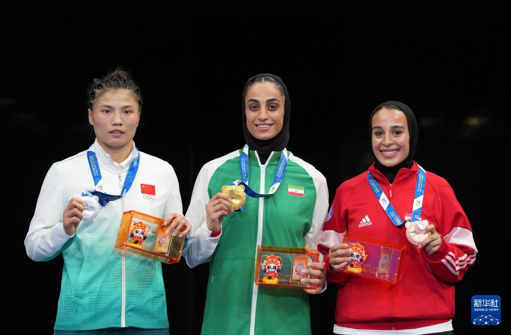 8月12日,冠軍伊朗選手婭薩曼(中)、亞軍中國選手朱海蘭(左)和季軍埃及選手阿里在頒獎儀式中。