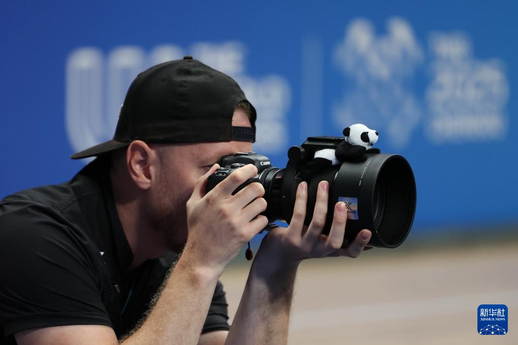 8月13日,比賽現(xiàn)場一名記者在鏡頭上裝飾了熊貓玩偶。