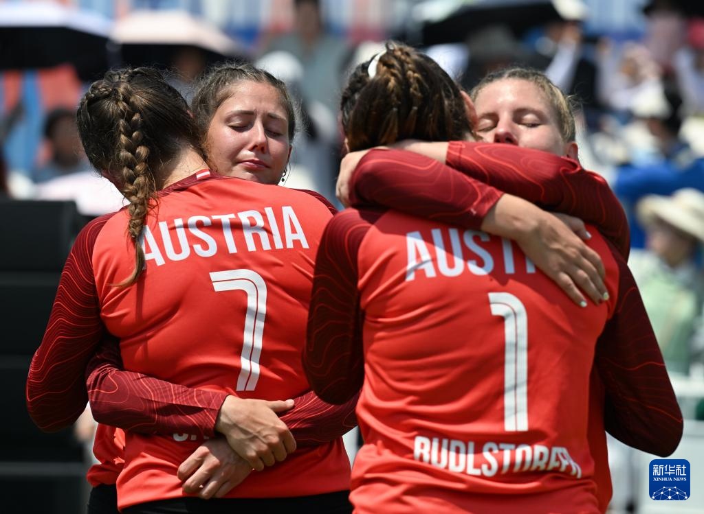 8月13日,奧地利隊(duì)球員在比賽結(jié)束后互相擁抱安慰。