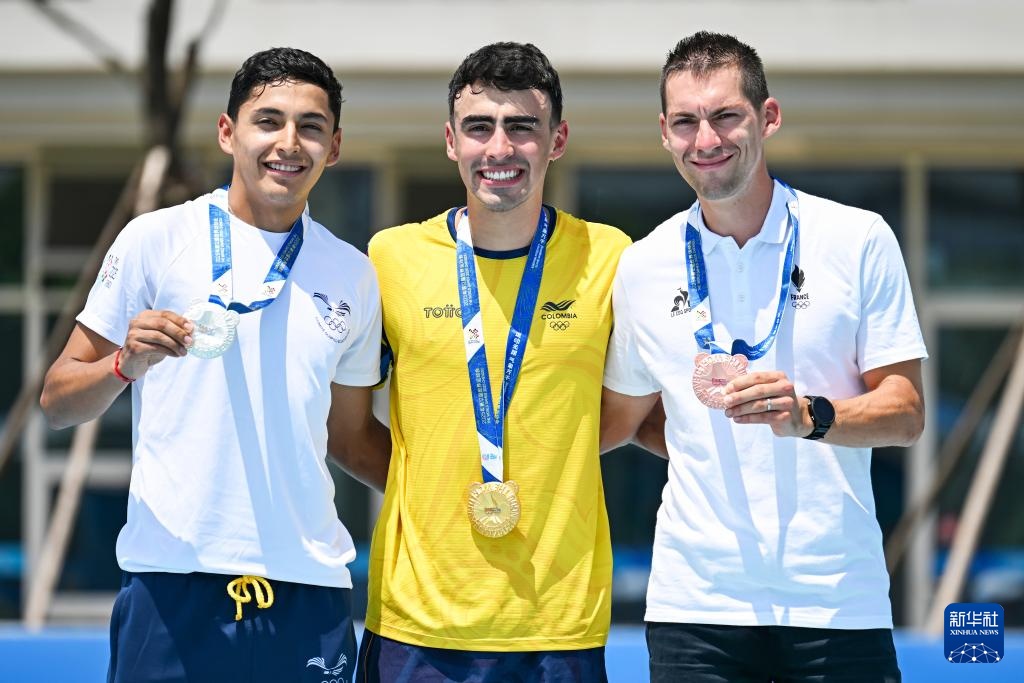 8月13日,冠軍哥倫比亞隊選手曼蒂利亞(中)、亞軍厄瓜多爾隊選手加西亞(左)和季軍法國隊選手費(fèi)里埃在頒獎儀式上。