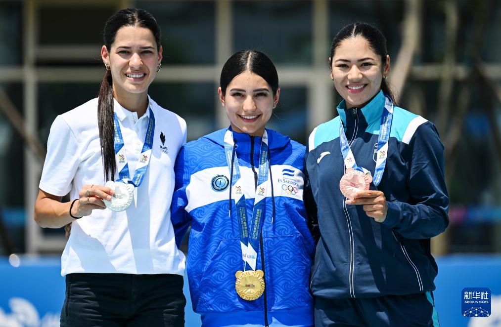 8月13日,冠軍薩爾瓦多隊選手加利亞多(中)、亞軍法國隊選手布呂內(nèi)(左)、季軍危地馬拉隊選手達利婭在頒獎儀式上。