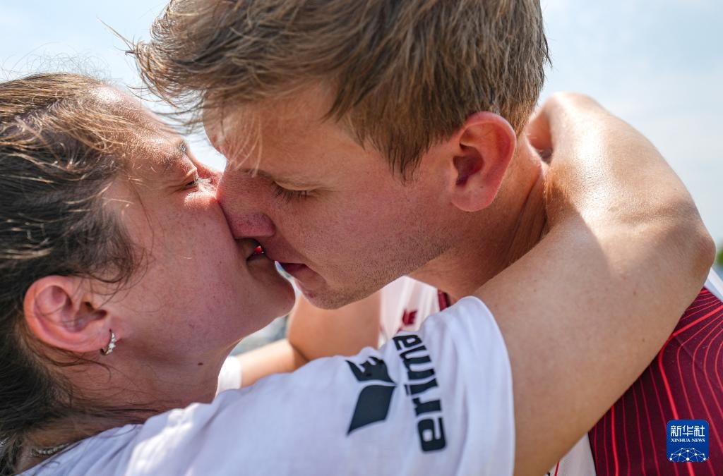 8月13日,奧地利隊(duì)球員皮林格爾在比賽勝利后和女友擁抱慶祝。
