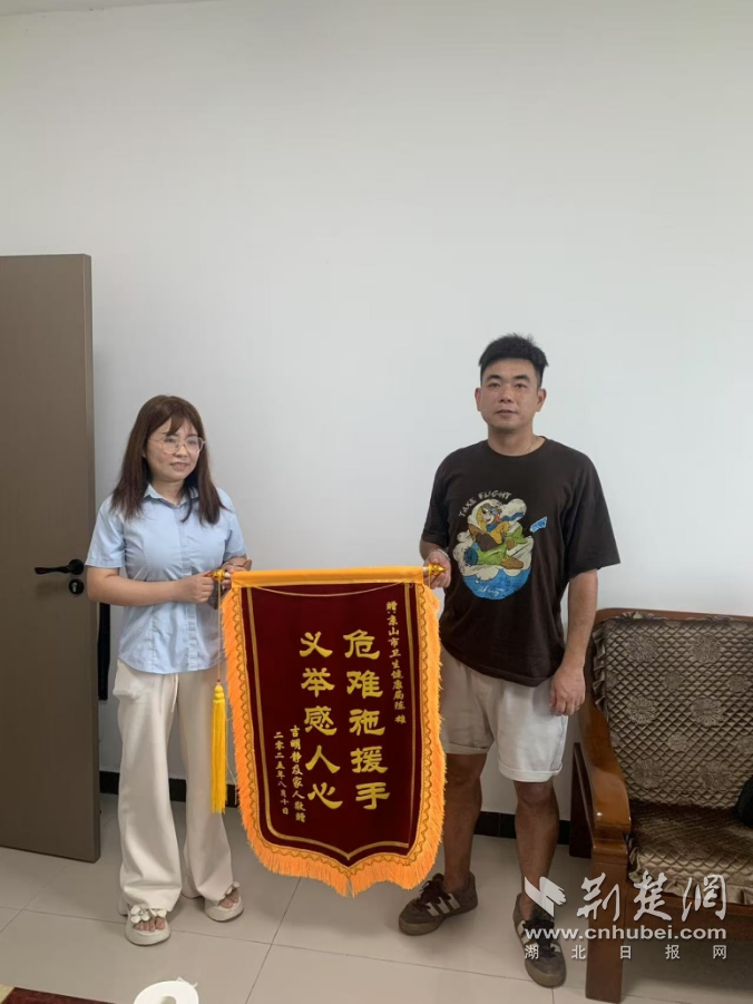 荊楚網(湖北日報網)訊(通訊員常夢星 馬帥林)8月13日上午,京山市市民吉女士將一面印著“危難施援手 義舉感人心”的錦旗送到京山市衛生健康局辦公室,感謝退役軍人陳雄跳水救起自己的小侄女。