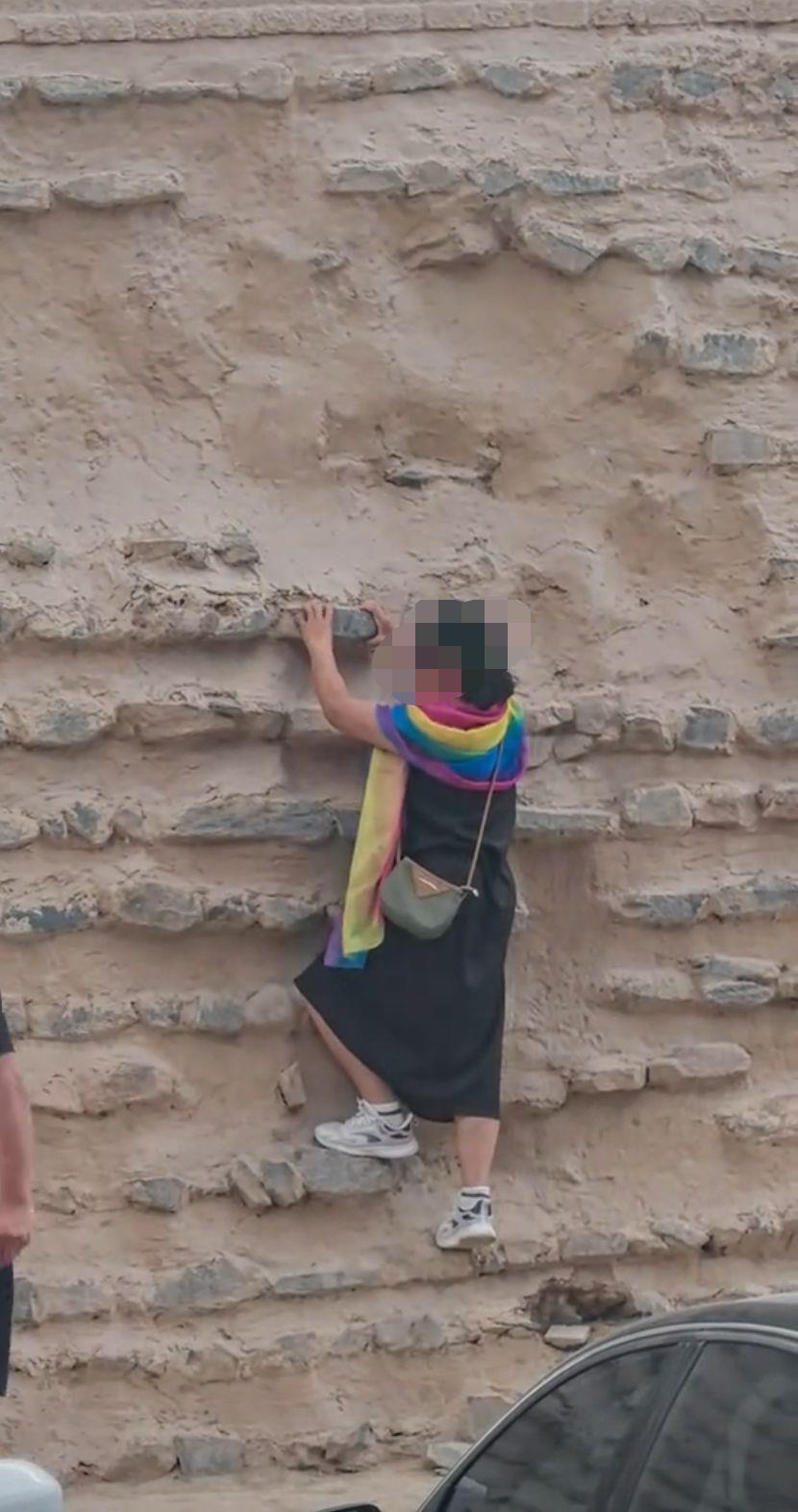 近日,有網友發視頻稱,有游客徒手攀爬嘉峪關懸壁長城,“長城上的石頭都快被扒光了”。視頻中,一女子攀爬上長城后進行拍照。8月13日,嘉峪關關城景區工作人員告訴極目新聞記者,懸壁長城始建于明代,之后進行了修繕,屬文物。事發后,工作人員已經到現場進行了查看,景區墻體沒有產生很大損壞,并表示該地禁止游客攀爬。目前,景區已在該區域設置了警示牌,并加大了巡邏力度,后期還會增設圍擋。
