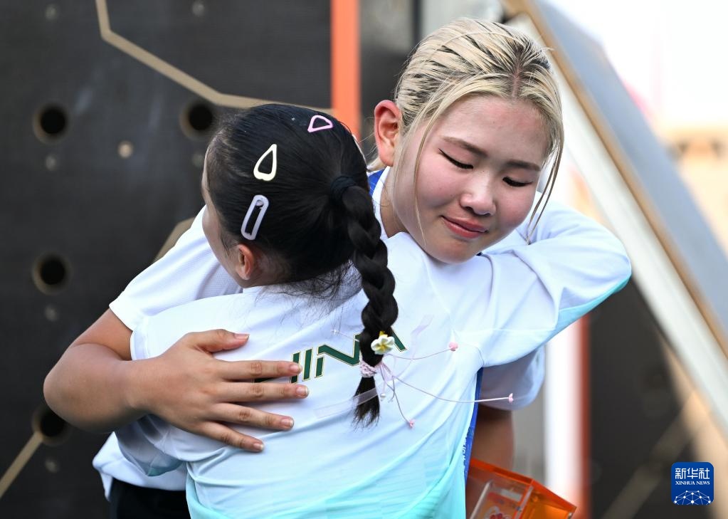 8月13日,冠軍中國選手商春松(左)與亞軍日本選手永井音寧在頒獎儀式上擁抱。