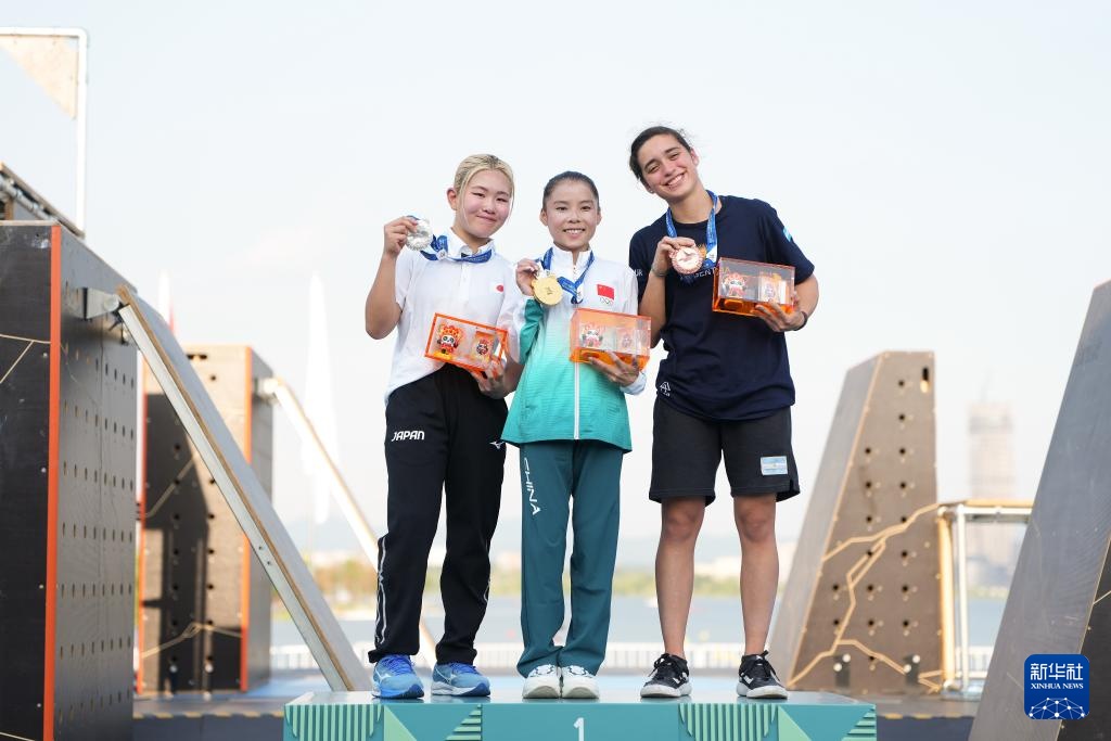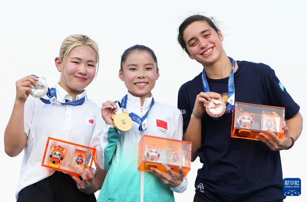 8月13日,冠軍中國選手商春松(中)、亞軍日本選手永井音寧(左)、季軍阿根廷選手薩拉在頒獎儀式上合影。