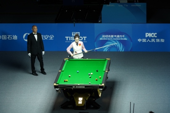 中國(guó)球員史天琪在中式臺(tái)球比賽中擊球。受訪者供圖