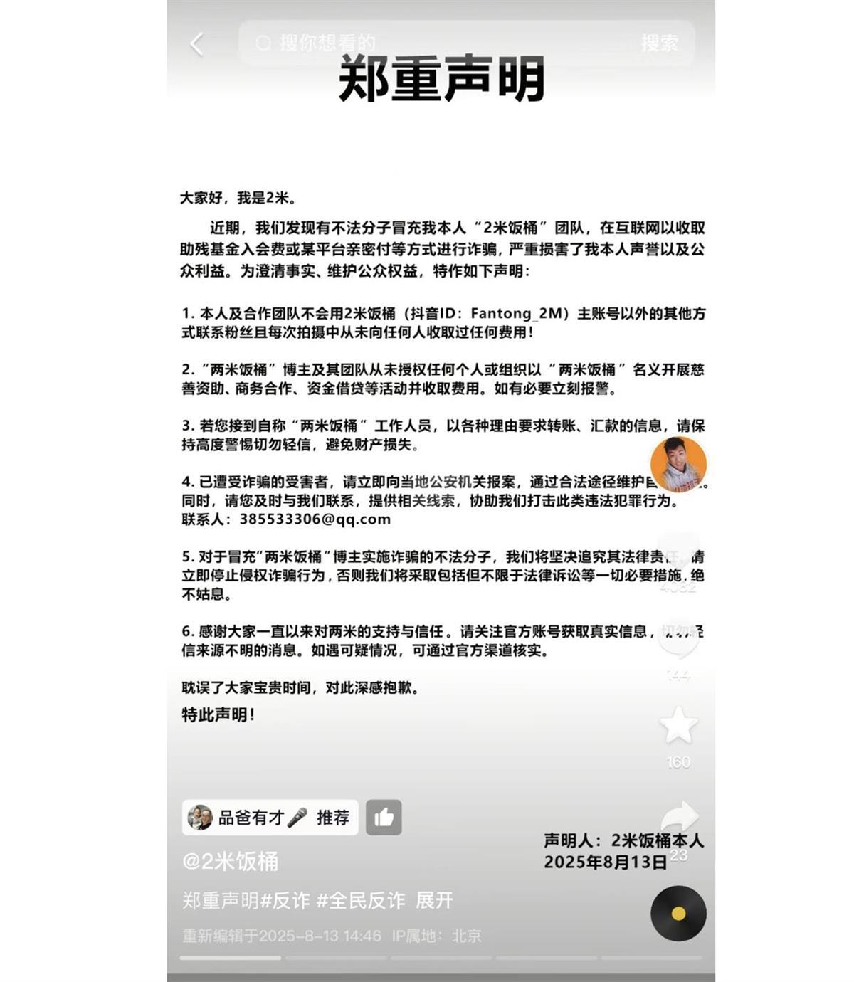 極目新聞記者注意到,博主“2米飯桶”也看到了這件事情,并在尹先生的視頻下評論,提醒網友謹防上當受騙并對此事件表示抱歉。該博主還在自己的賬號發布聲明,對于冒充其實施詐騙的不法分子,該博主及其團隊表示將堅決追究其法律責任。