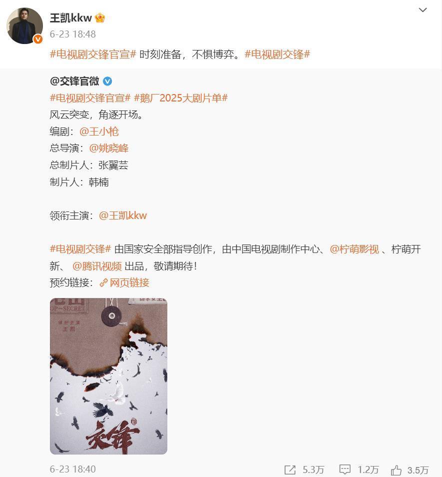 距離王凱《大江大河3》殺青已經過去兩年時間,一直被粉絲和網友強烈呼喚“進劇組開工”的他,也即將迎來自己的新角色。他對極目新聞透露,自己即將開拍由國家安全部指導創(chuàng)作的國安題材電視劇《交鋒》,此消息于前不久剛剛官宣。至于飾演的具體角色,他賣了一個關子,稱這個角色與他自己以往的熒幕形象相比不太常見,“甚至是沒有過的,會給大家耳目一新的一個印象?!彼€喊話網友:“會有一個小驚喜,大家期待一下?!?/p>