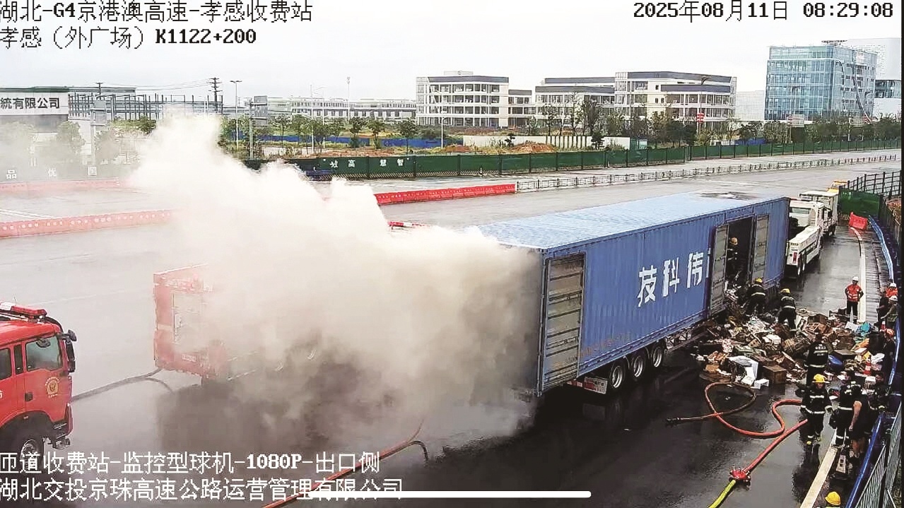 在孝感收費站收費廣場,預先得到通知的工作人員“秒級響應”,迅速啟動重大事件應急預案,安排人員早早等候在預先設置的專用車道,在救援車輛到來之時快速引導到收費廣場安全處置區處理險情。隨后消防員破開掛車后尾廂,運用熱成像儀排查陰燃點,采用“水霧+泡沫”分層滅火技術將陰燃貨物逐一撲滅。經過“一路多方”跨部門2小時的協同作戰,終于將險情徹底排除。