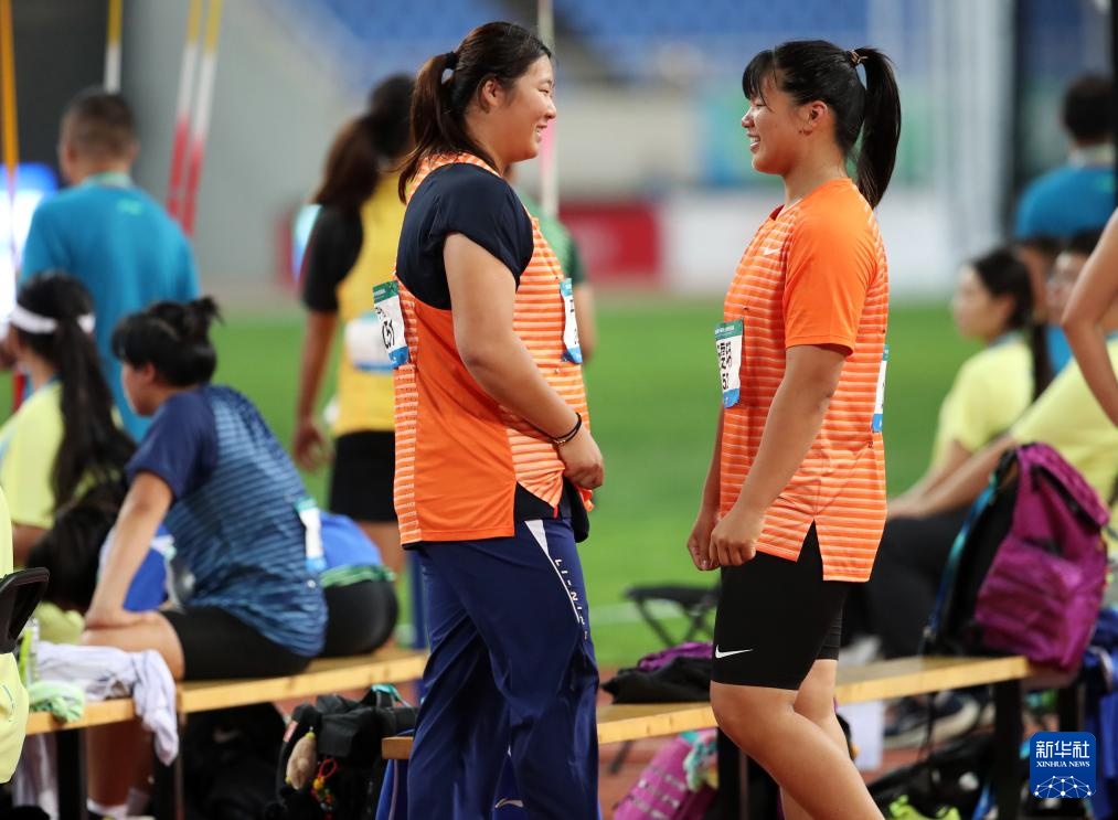 8月13日,浙江隊選手嚴子怡(左)和楊雯玥(右)在女子標槍團體決賽中。最終,浙江隊獲得第一名。
