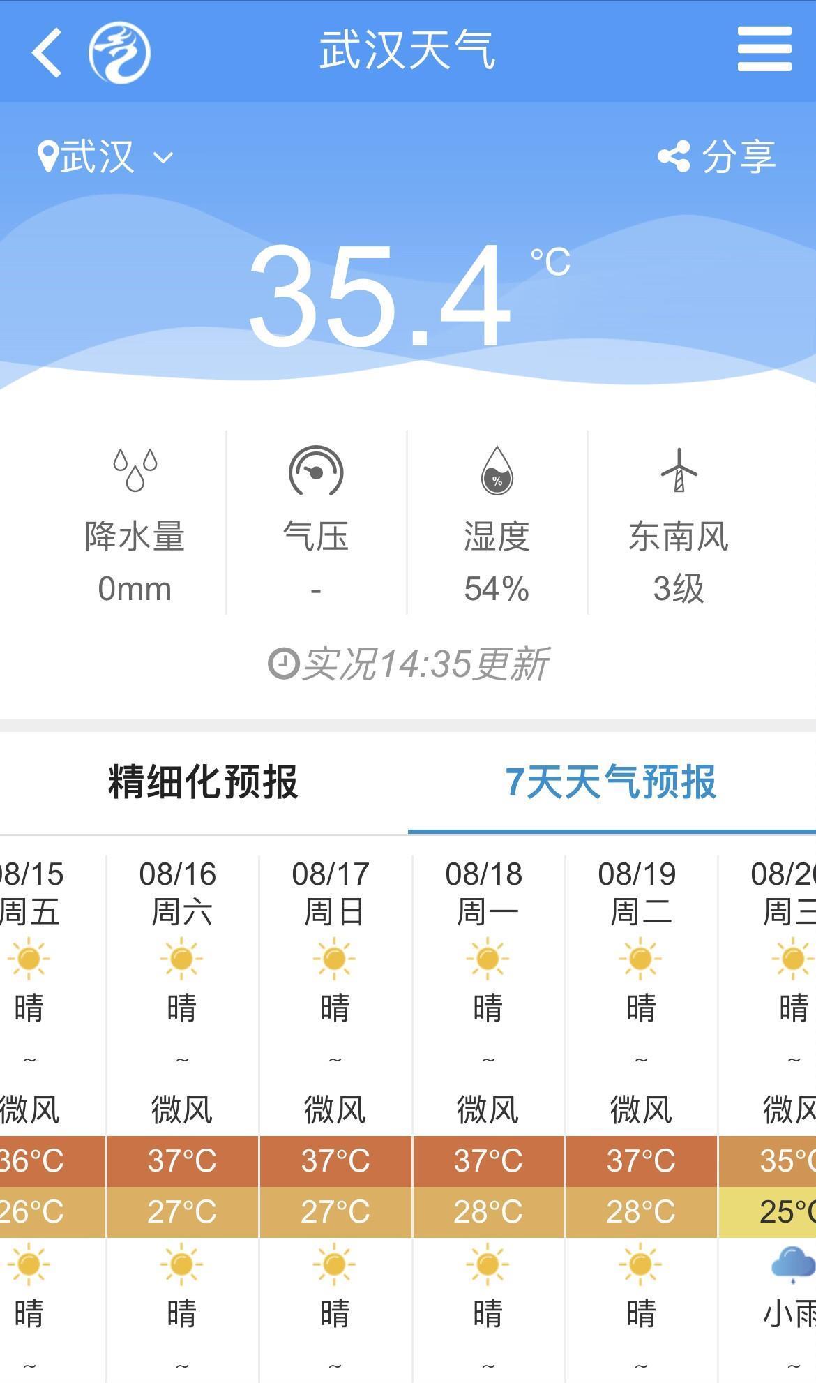 “未來一周,武漢熱熱熱熱!”氣象部門今日已定調(diào)。其中,15日-16日(周五至周六)只是重燃小火,最高氣溫37-38℃,17-19日(周日至下周二)最高氣溫更上一層樓,局地40℃以上,注意防暑降溫。