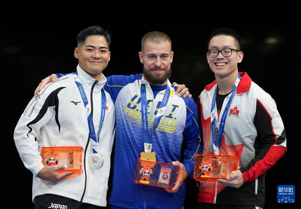 8月14日,冠軍美屬維爾京群島選手約瑟夫·喬丹(中)、亞軍日本選手牛山恭太(左)和季軍加拿大選手克利夫頓在頒獎儀式上。