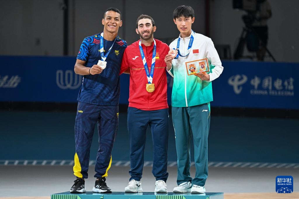8月14日,冠軍西班牙選手古斯曼·比塔爾(中)、亞軍哥倫比亞選手塔斯孔·奧爾古因(左)和季軍中國選手張振海在頒獎儀式上。