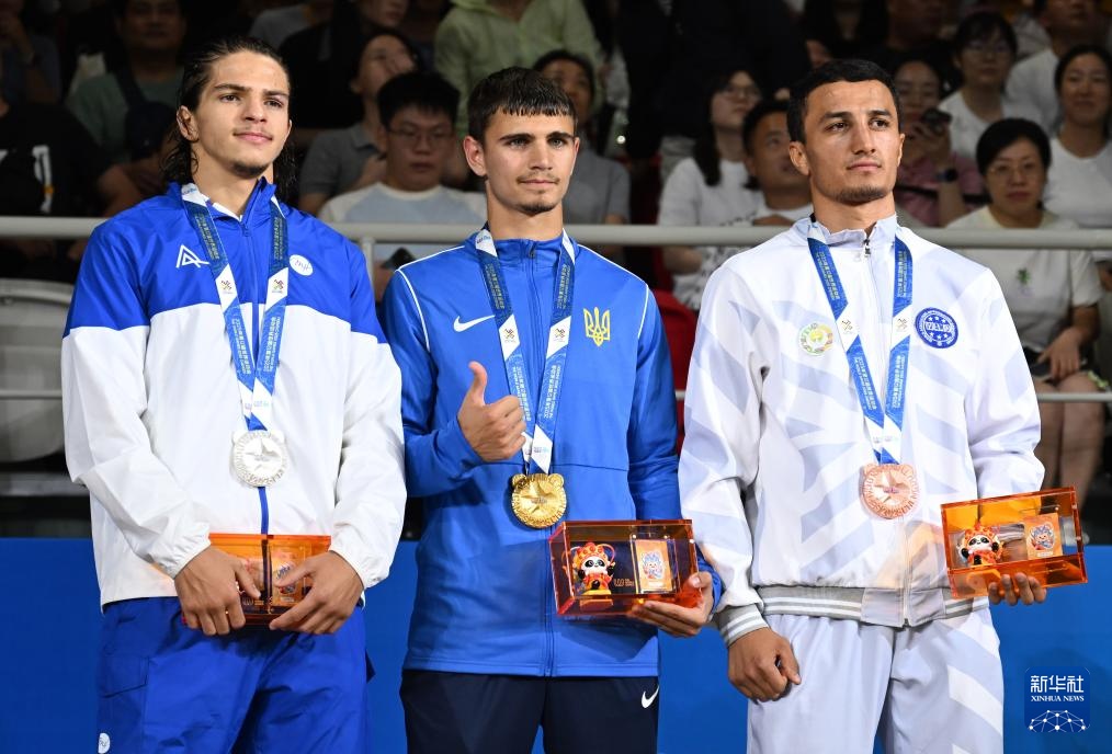 8月14日,冠軍烏克蘭選手馬祖爾(中)、亞軍阿塞拜疆選手古利耶夫(左)與季軍烏茲別克斯坦選手阿西爾別克在頒獎(jiǎng)儀式上。
