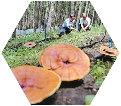 河北省圍場滿族蒙古族自治縣哈里哈鎮八十三號村,基地工作人員正查看靈芝長勢。王立群攝